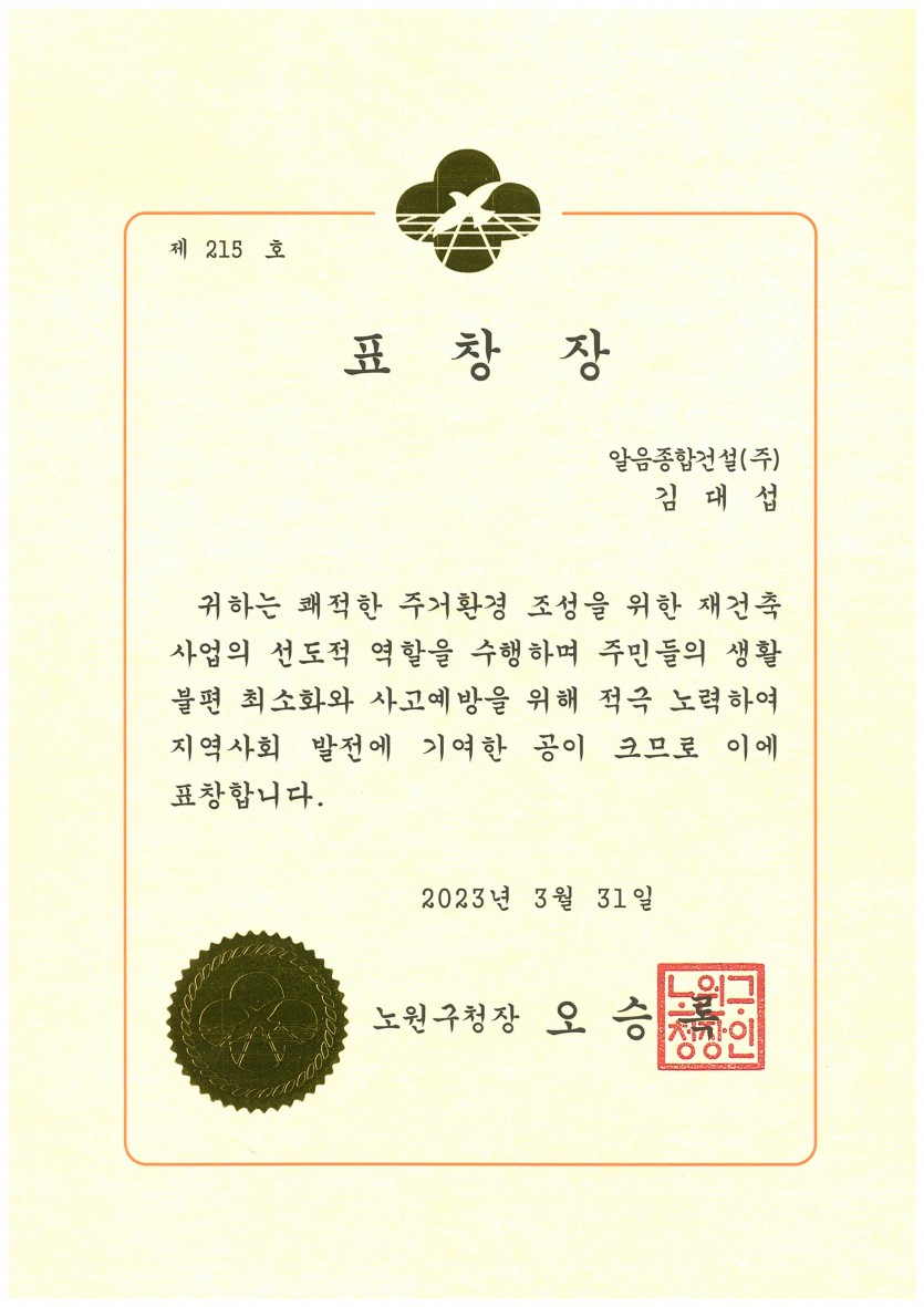 노원구청장 표창장 페이지 정보 작성자 알음종합건설 댓글 0건 조회 497회 작성일 23-11-03 16:21 목록 본문 20230331 이전글경기도지사 표창장 23.11.03 다음글신용등급확인서 22.04.18